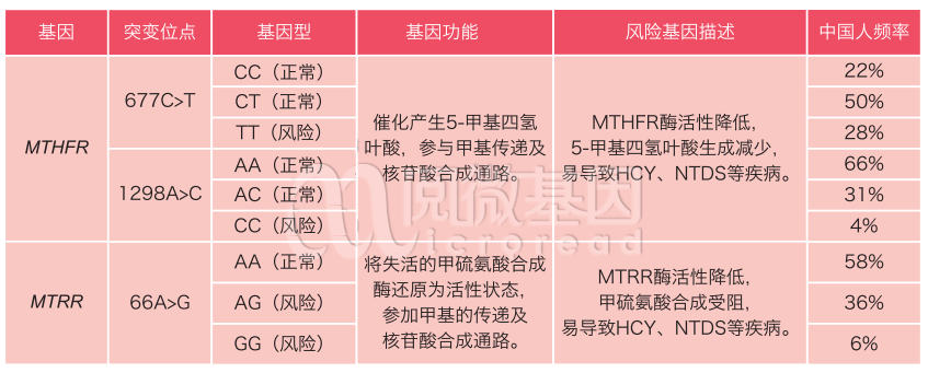 亚甲基四氢叶酸还原酶 (MTHFR) 和甲硫氨酸合成酶还原酶 (MTRR) 是 Hcy 代谢过程中的关键酶,其基因多态性是造成个体间叶酸利用能力差异的主要原因。当 MTHFR 或 MTRR 基因发生突变,其酶活性降低,从而导致叶酸代谢发生障碍。