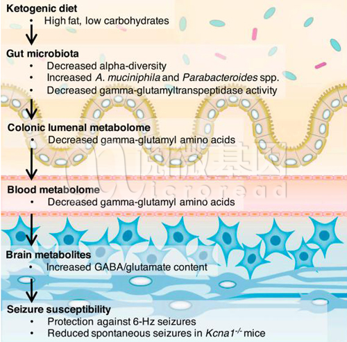 癫痫是一种严重的神经系统疾病,其病因尚未取得充分的认识。2018年5月,来自加州大学洛杉矶分校(UCLA)的科学家们将新研究成果发表在Cell 杂志[3]。他们发现生酮饮食大大改变了肠道菌群,使小鼠癫痫发作的次数显著减少。顺利获得肠道16S测序,确定生酮饮食会使2种类型的细菌丰度升高,分别为Akkermansia muciniphila 和Parabacteroides species。接着联合应用GC-MS和LC-MS平台检测肠道、血液和海马体(与癫痫发作主要相关的脑部区域)中的代谢物,发现细菌的变化改变了肠道和血液中γ-谷氨酰氨基酸水平,从而增加了神经递质GABA在大脑中的表达,而GABA可以使神经元沉默下来,减少癫痫的发作。