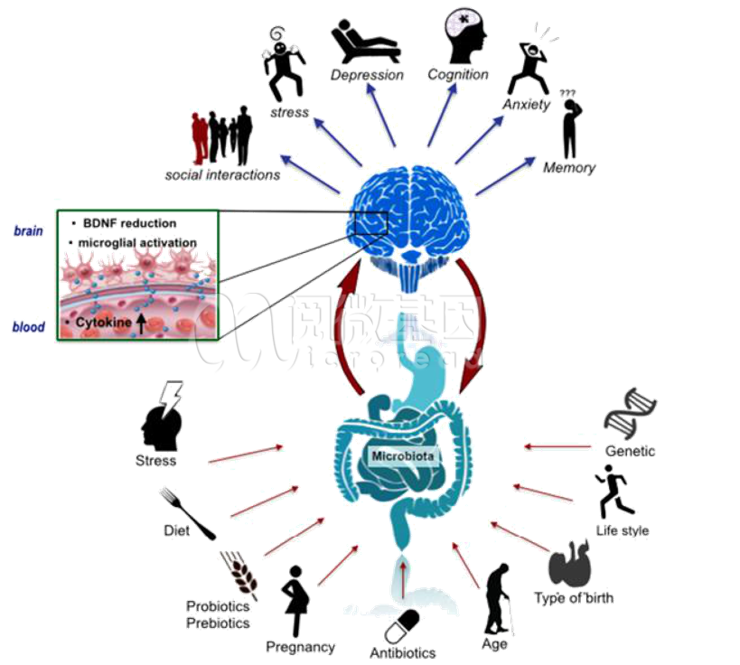 肠道微生物可以顺利获得产生或分泌物质影响大脑,同时大脑也可以顺利获得特定系统向肠道反馈信息。这种从肠道到大脑和从大脑到肠道的双向连接传递系统被称为“肠脑轴”或者“脑肠轴”。