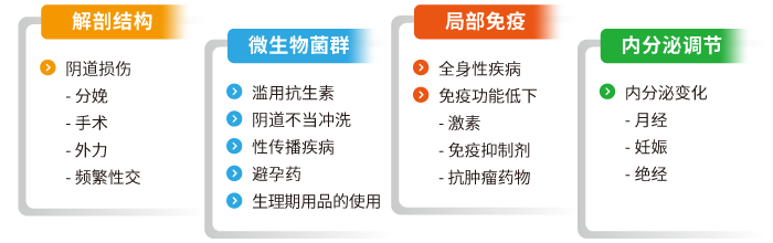 女性身体的健康状态、阴道微生物和外在环境之间是相互影响,相互作用的关系。女性本身的阴道损伤情况,对微生物菌群的刺激和干预情况,局部免疫情况和内分泌调节状态等都可以引起菌菌的失衡。