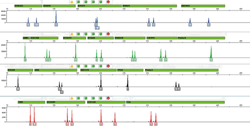 毛细管电泳仪利用荧光标记以及荧光反射的特性,顺利获得计算DNA在毛细管中的移动速率进行DNA片段分析。将上一步扩增完成的PCR板放入机器中,设置好参数信息,大概30-45min后,顺利获得设备配套软件便取得如下分析结果: