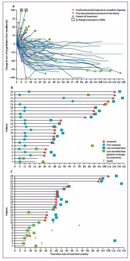 截止2017年1月时,仍有36名(49%)患者仍在接受治疗。23名患者取得了客观缓解,51名患者在接受纳武单抗治疗12周时疾病得到了控制。
