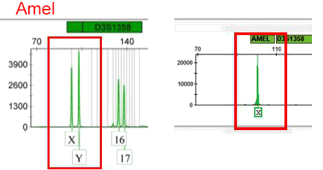 Amel在男性检材(左)会出现X和Y两个片段大小有差异的双峰,在女性检材(右)仅出现单峰