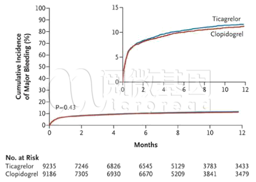 图3 替格瑞洛(蓝)和氯吡格雷(红)临床出血风险