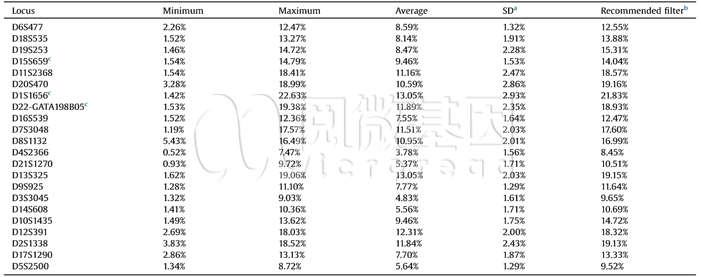 本研究共观察了200份样本的影子峰。表中各列从前到后分别为:基因座名称、观察到的最低影子峰占主峰的比例、观察到的最高影子峰占主峰的比例、平均影子峰比例、影子峰比例的标准差、以及根据此研究推荐的影子峰比例阈值。其中,影子峰比例推荐阈值的计算方法为:影子峰比例平均值+3倍的标准差。