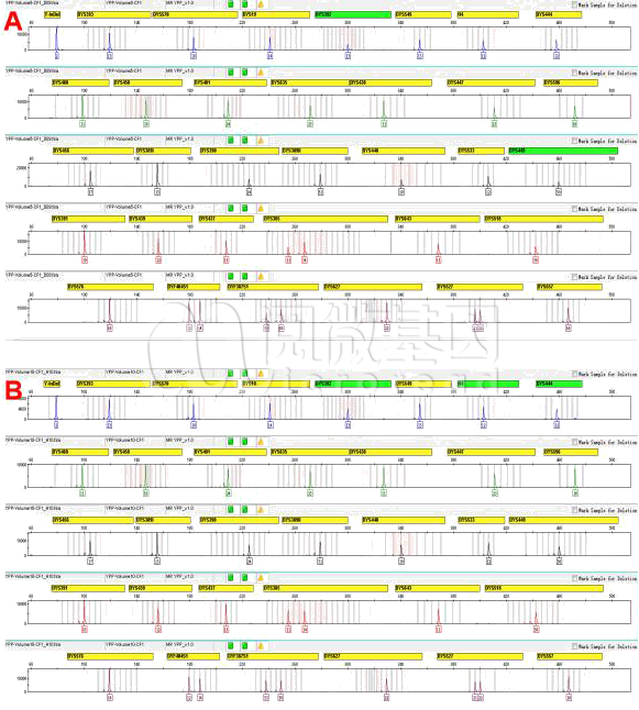 先来看两份分型图,分别是5微升及10微升PCR体系的结果,见图2。所有的信号峰都检出了,而且峰高都很高,那此时该如何评价分型效果呢?