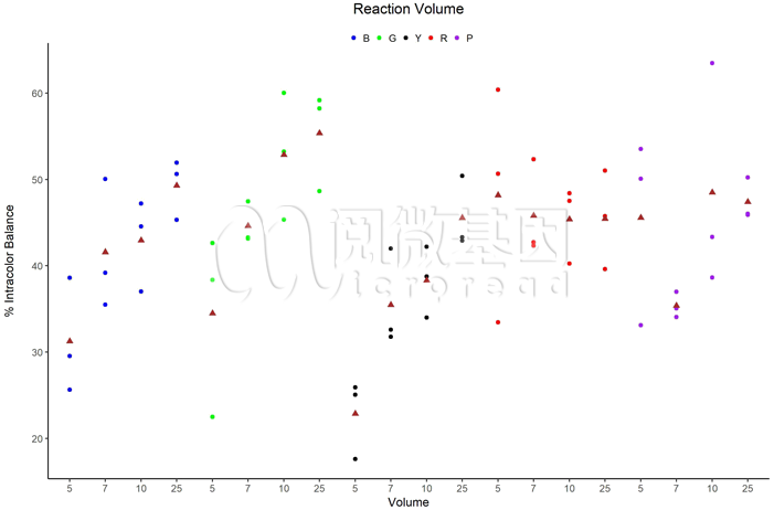 均衡性计算结果如图3所示。其中每一种颜色代表相应的染料组,每一体积进行了三次平行实验,其组内均衡性计算结果用一个圆点表示。图中红色三角形代表了三次平行实验组内均衡性的平均值。可以看出,随着反应体系体积的减小,分型结果的组内均衡性有降低的趋势。其中,25微升体系和10微升体系的组内均衡性相差较少。