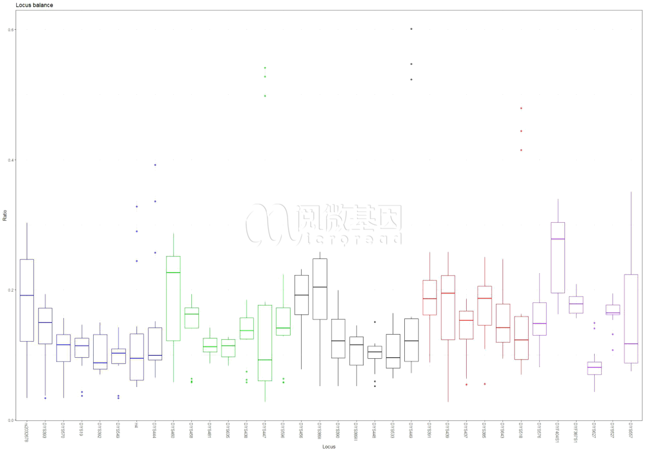 如图4所示,该结果给出了全部基因座的峰高占比的箱图,可以用于试剂盒优化。这里的“均衡性”计算方法为将某一样本中某一染料组的峰高之和定义为100%,计算该染料组内各个基因座的峰高的占比,可以直观地展现某一染料组内各个基因座的峰高对比。
