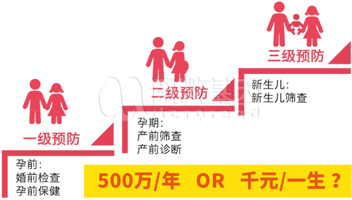 出生缺陷主要分为三级预防,一级预防主要包括婚前检查、孕前或孕早期保健,以预防出生缺陷的发生;二级预防主要在孕期顺利获得早发现、早诊断和早采取措施,以减少严重缺陷儿的出生;三级预防主要进行新生儿筛查,为了缺陷患儿出生后可以采取及时、有效的诊断治疗和康复。