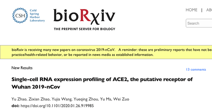 2020年1月26日,同济大学附属东方医院的左为团队在 bioRxiv 上发表文章,其团队基于公开的数据库,分析单细胞测序数据,研究了共计43000多个肺组织细胞[2]