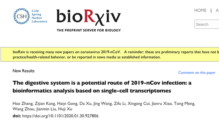 2020年1月31日,上海第二军医大学附属长征医院徐沪济团队等在 bioRxiv发表文章。其团队依然基于公开的数据库,对肺部和消化道中的不同组织细胞进行了单细胞层面的分析[3]