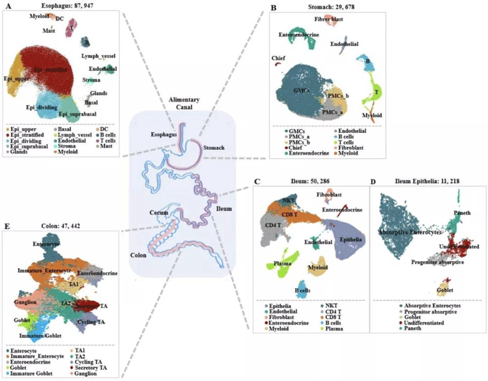 在此研究中,作者对除肺组织外的消化道中不同组织的4个基因集进行单细胞转录组分析,分别为食管的87,947个细胞,胃部29,678个细胞,回肠50,286个细胞和直肠的47,442个细胞。