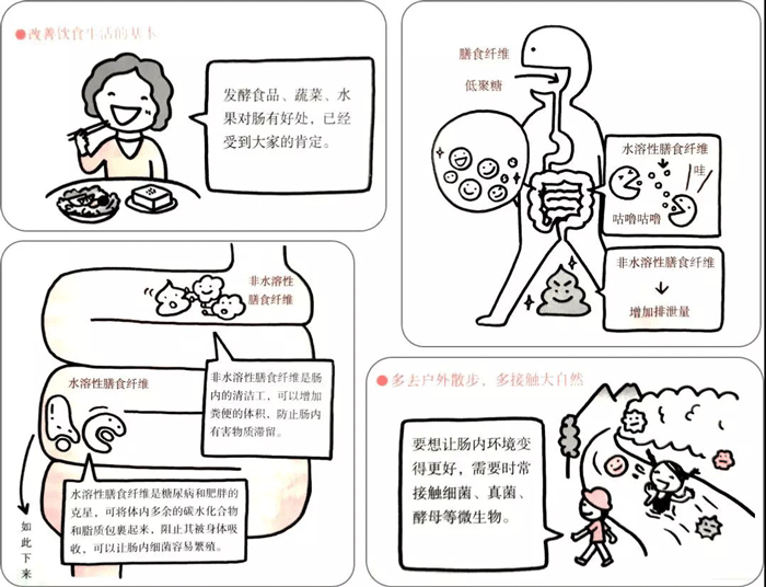 维持肠道菌群健康最基本的两个方式,就是增加膳食纤维的摄入和户外运动。我们肠道内的有益菌特别喜欢食用含有膳食纤维和低聚糖的食物。其中水溶性维生素(海带、裙带、豆制品、水果中含量丰富)和低聚糖(淀粉、砂糖中含量丰富)可以显著促进有益菌的生长,而非水溶性膳食纤维(谷类、蔬菜、豆类食品中含量丰富)虽不能在体内消化,但可刺激肠道蠕动,促进排便。户外运动除了可以增强肠道蠕动,还给了体内微生物与外界环境研讨切磋的机会。