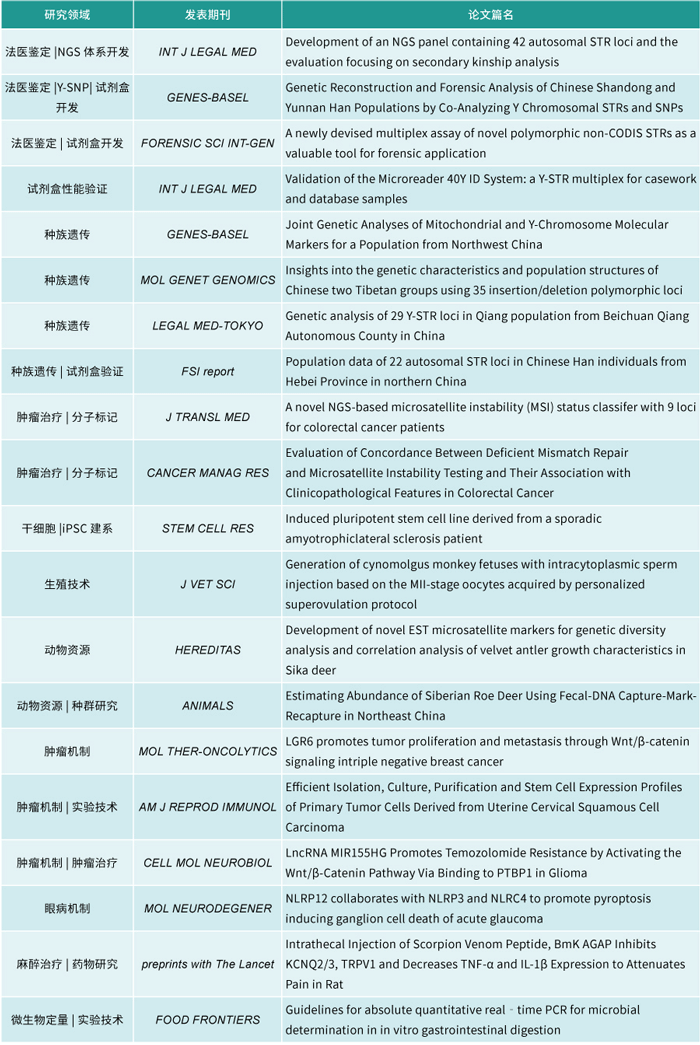 以 ■澳门十大棋牌排行榜最新■澳门十大棋牌排行榜推荐 的三大服务领域区分,科研文章最多(10篇),覆盖细胞鉴定与个体识别、微生物快速定量、特产物种微卫星标记开发及种群研究等项目;法医领域8篇,包含试剂盒开发和验证、各民族(汉族、藏族、吉尔吉斯族、彝族、羌族)Y染色体分子标记种族遗传;临床领域2篇,均与结直肠癌分子标记MSI相关,研究不同技术方法间的关联性。