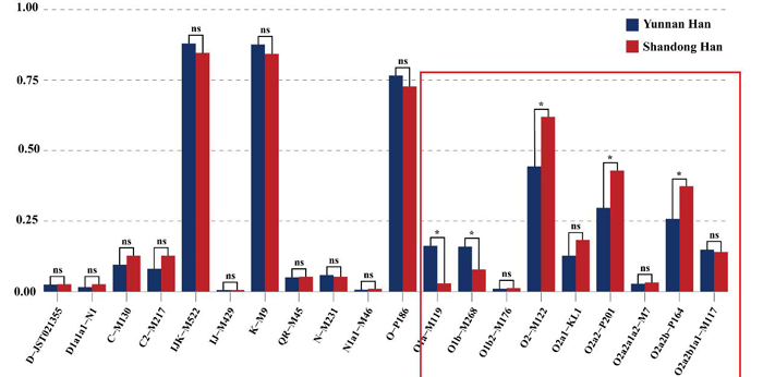 O1和O2单倍型在中国北方汉族(山东)和南方汉族(云南)的基因频率差异