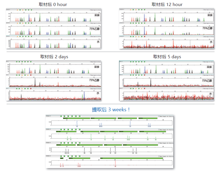 实验证明,使用“采保”取材的模拟检材,35℃闭管放置3周后提取,扩增效果与取材后马上提取无显著差别,远远优于传统试剂保存方法!