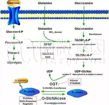 O-GlcNAc修饰水平受到两个重要酶的调节,分别是:1. O-GlcNAc transferase (OGT),催化O-GlcNAc糖基化过程;2. 相反Human O-GlcNAcase (hOGA),则能够水解O-GlcNAc,降低O-GlcNAc糖基化水平。如下图: