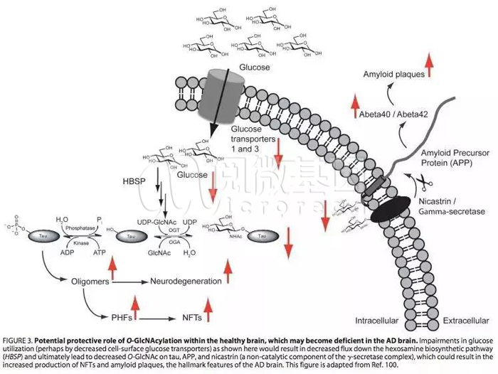 现在研究已经证实,阿尔茨海默糖代谢水平低下,O-GlcNAc修饰水平影响Tau蛋白磷酸化,因此,提高O-GlcNAc修饰水平具有潜在的降低Tau蛋白磷酸化水平的作用,Tau蛋白磷酸化水平的降低有助于改善并减缓阿尔茨海默病程进展。