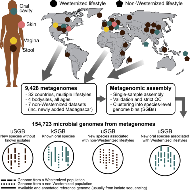在近期发表在Cell期刊的一项研究中,由意大利特伦托大学Nicola Segata领导的研究团队利用来自不同地理位置、生活方式和年龄人群的9,428个宏基因组,突破性地重建了154,723个人体微生物基因组(45%高质量),其中很多代表了此前未发现的新物种。值得关注的是大多数新发现的微生物存在于在非西方化人群中。