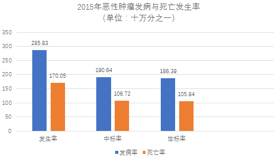 2015年恶性肿瘤发病率为285.83/10万,中标率(中标率:人口标准化率按照2000年中国标准人口结构)为190.64/10万,世标率(世标率:人口标准化率按照Segi's世界标准人口结构)为186.39/10万,累积率(0~74岁)为21.44%。2015年中国恶性肿瘤死亡率为170.05/10万,中标率为106.72/10万,世标率为105.84/10万,累积率(0~74岁)为11.94%。
