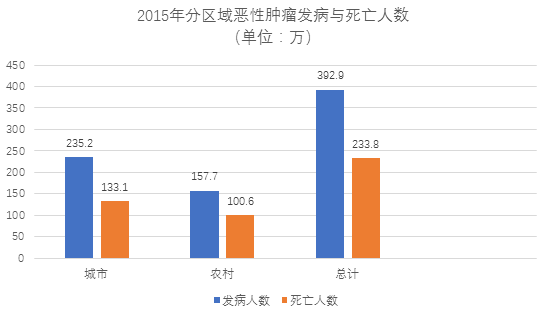 2015年恶性肿瘤发病约392.9万人,死亡约233.8万人。平均每天超过1万人被确诊为癌症,每分钟有7.5个人被确诊为癌症。与历史数据相比,癌症负担呈持续上升态势。近10多年来,恶性肿瘤发病率每年保持约3.9%的增幅,死亡率每年保持2.5%的增幅。