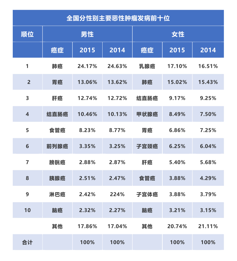按发病人数顺位排序,肺癌位居我国恶性肿瘤发病首位,估计结果显示,2015年我国新发肺癌病例约为78.7万例,发病率为57.26/10万,中标率为35.96/10万。其他高发恶性肿瘤依次为胃癌、结直肠癌、肝癌和乳腺癌等,前10位恶性肿瘤发病约占全部恶性肿瘤发病的76.70%。与2014年相比,各类高发癌症的顺位完全相同,占比变化不大,甲状腺癌上升相对明显。