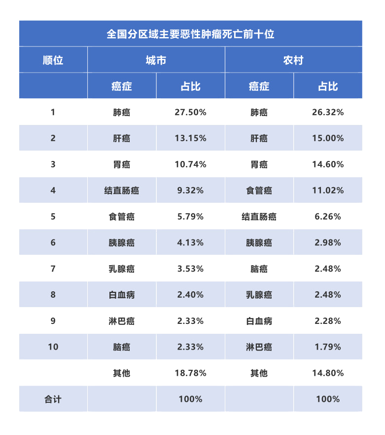 城市地区与农村地区的恶性肿瘤死因顺位不同,城市地区主要恶性肿瘤死因依次为肺癌、肝癌、胃癌、结直肠癌和食管癌,农村地区主要恶性肿瘤死因依次为肺癌、肝癌、胃癌、食管瘤和结直肠癌,城市地区与农村地区前10位恶性肿瘤死亡分别占城乡全部恶性肿瘤死亡的81.30%和85.20%。