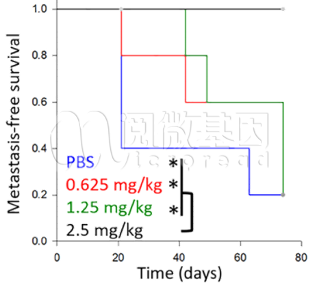 实验中最显著的差异其实是生存率。Kaplan-Meier曲线(下图)显示了不同处理小鼠的无转移存活,其中用DCL治疗的小鼠存活时间最长。