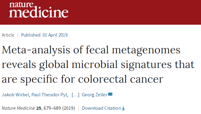 [2] Jakob Wirbel et al., (2019) Meta-analysis of fecal metagenomes reveals global microbial signatures that are specific for colorectal cancer. Nature Medicine. DOI: 10.1038/s41591-019-0406-6