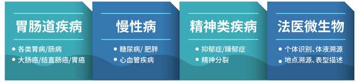 其次,胃肠道疾病、精神类疾病与慢性病均为多发或常见疾病类型,患者人群数量众多;疾病本身具有重要研究价值和成果转化意义,可切实地应用于改善患者病症。与此同时,法医领域也在近年来关注到微生物研究,部分课题已有研究成果。