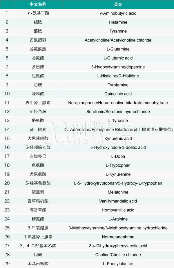 ■澳门十大棋牌排行榜最新■澳门十大棋牌排行榜推荐 的合作伙伴安隆科讯新推出29种神经递质和神经代谢物检测服务,是现在市面上更全的神经类代谢物检测panel,其中包括生物原胺类与氨基酸类中常见的神经递质。更全的靶向神经递质检测将大大加快和助力“肠脑轴”的研究,一改以往只能检测个别神经递质或使用LC-MS广筛的局面。