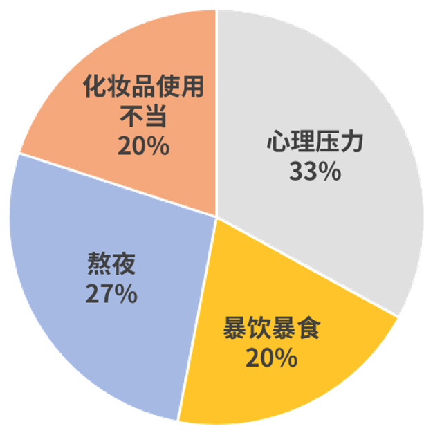 研究指出,导致痘痘发生的因素很多,包括遗传、荷尔蒙分泌、角质细胞功能异常、饮食、精神焦虑及护肤品使用不当等等。而由个人习惯导致的主要如下: