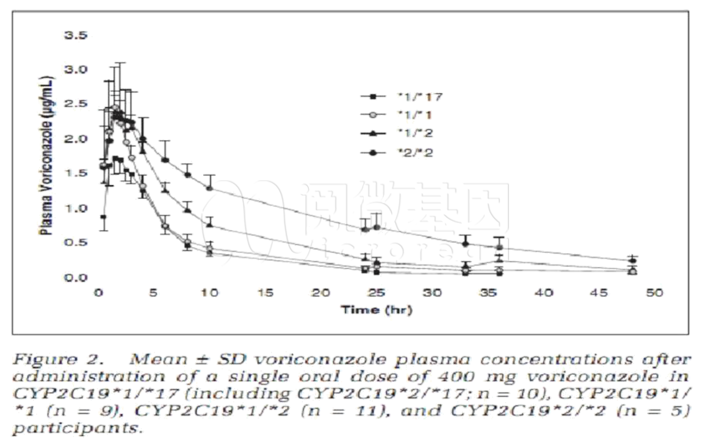 伏立康唑主要在肝脏中顺利获得CYP2C19进行代谢,其活性存在显著的个体差异和种族差异,表现为遗传高度多态性。野生型CYP2C19*1等位基因编码正常功能的CYP2C19酶,CYP2C19*2和*3为该基因弱代谢型的主要突变体,这两个等位基因的突变可引起药物代谢明显减弱,而CYP2C19*17突变,显著升高了酶活性,是一种快速代谢基因型。