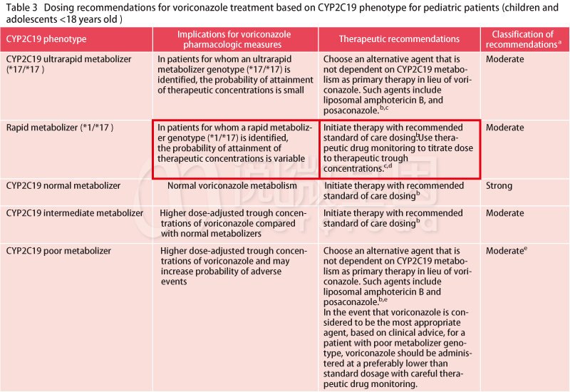 2. 对于儿童快速代谢者,推荐以标准剂量开始,监测血药浓度并调整到最佳治疗剂量。 (及时取得具有超速和快速代谢表型的儿科人群中的伏立康唑治疗浓度是困难的。由于在达到治疗浓度时可能会失去关键时间,因此建议使用替代抗真菌药,以便孩子尽快接受有效的抗真菌治疗。)