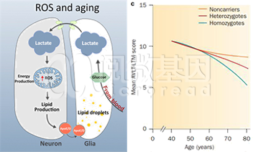 APOE ε4等位基因与阿尔兹海默症发病关系,左图说明过氧化脂质机制(来源:L Liu 2017),