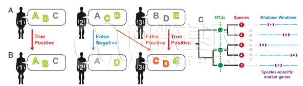 A. 三个个人及其宏基因组特征(用大写字母表示)所示。称这些特征为为宏基因组特征编码。B.三人数周甚至数月后的情况。个人1微生物不断很稳定 (真阳性)。个人2已经失去C特征编码, 不能和之前的他所对应。个人3已经失去了功能B和C,但取得D。E确保他仍保持之前的特征编码,但此时对于个人2来说则可能是个假阳性。C、利用四种微生物基因组测序后得出的参数可进行身份识别,分别为OTU、物种类别、参考基因组中的Kilobase windows(kbwindows)和物种特异性标记基因。