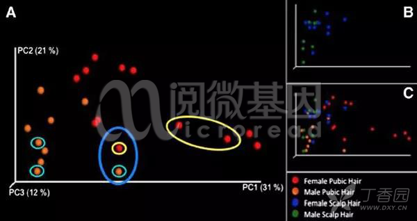 为分析决这个问题,本研究希望顺利获得对比嫌疑人和受害者阴毛上的细菌,建立一个微生物指纹,从而确定强奸犯。研究者在5个月里采集了7个人(其中两人同居)的头发和阴毛样本,然后分别在2个月和5个月后,检查毛发上的菌群构成。结果显示,男性的头发样本中有50种不同的微生物,而女性头发样本中则有55种,不过这其中大部分微生物不具备个体差异。而阴毛样本则不同,阴毛中细菌种类更多,男性约有73种而女性有76种,且更具特异性—每个人的阴毛中都有独具“个人特色”的细菌,且5个月内也基本没有变化。结果显示,阴毛中细菌的多样性更高也更具有个人独特性,且同居伴侣的阴毛样本上细菌的相似度要更高。