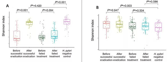 Hp感染诱导胃部菌群多样性降低,根除治疗成功可使菌群多样性上升,接近未感染者水平