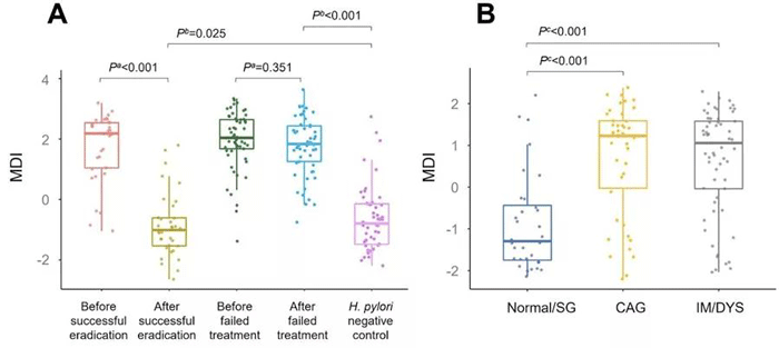 结合根除治疗后胃粘膜样本中选出的18个差异性菌属,该研究计算出胃部菌群紊乱指数(MDI),发现Hp根除治疗成功可显著降低MDI;而Hp根除治疗失败前、后,MDI始终保持较高水平,无显著变化。此外,MDI与胃部菌群多样性指数间存在显著负相关关系。