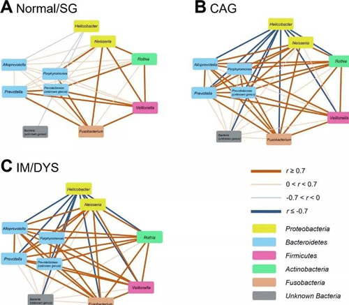 进一步研究发现,螺杆菌属在CAG和IM/DYS组中相对丰度显著上升,而另外九种菌属相对丰度显著下降,比如拟普雷沃菌属, 梭杆菌属、奈瑟氏菌属等。利用这10种菌属进行相互作用网络分析,发现在CAG和IM/DYS组中,菌属间相互作用显著增强,尤其体现在螺杆菌属与其他9种菌属的相互作用上。