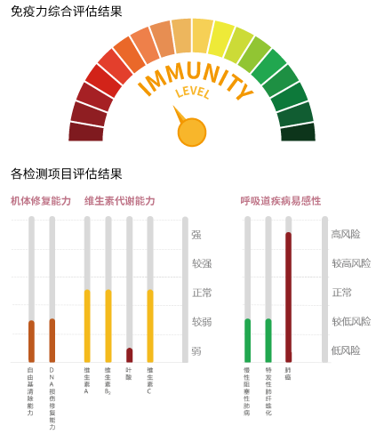 顺利获得☞“免疫力综合评估”基因检测 ☜,在分析自由基清除能力、DNA损伤修复能力、维生素A/B2/C和叶酸代谢能力、肺部疾病易感性的基础上,对个体免疫水平做出一个综合评判,可以从遗传层面分析免疫力差异的本质原因,从而从根源找到解决方案,实现个体化准确提升免疫力的目标。