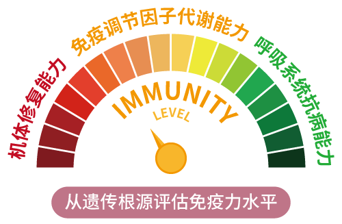 除日常观察和临床检测之外,基因检测为免疫力评估给予了一个新选择。因为免疫力除了受饮食、运动、环境、精神因素等后天因素的影响,还与先天的遗传因素息息相关。每个人先天免疫力的差异本质上是基因的差异。顺利获得对机体修复能力、免疫调节因子代谢能力及呼吸系统抗病能力三个维度的检测,可以分析个体免疫力在基因层面的差异,为下一步制定“免疫力提升方案”做充足的准备。
