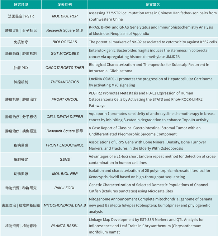 以 ■澳门十大棋牌排行榜最新■澳门十大棋牌排行榜推荐 的三大服务领域区分,科研服务文章最多(13篇),覆盖细胞鉴定与个体识别、肿瘤领域(机制、分子标记、免疫治疗、疾病开展及肠道菌互作)、疾病易感基因、动物资源(微卫星标记、种群研究)、植物性状定位、农业病虫害防治等;法医领域1篇,探究亲子样本Y-SNP的突变情况;临床领域1篇,探讨低位阑尾粘液性肿瘤及癌前锯齿状病变的分子病理特征。