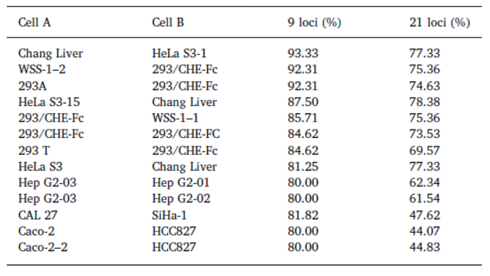 相似度高的不同细胞株用9基因座方法可能被错误认定为同源,但21基因座能明确区分