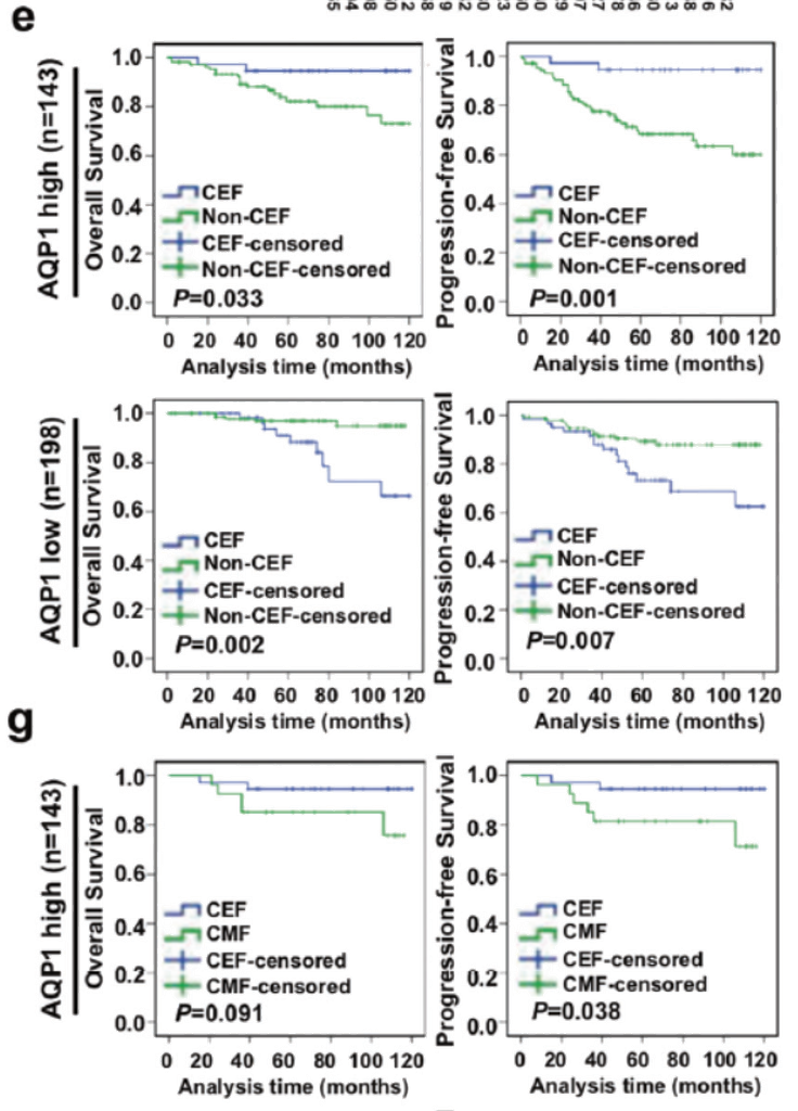 AQP1高表达患者接受CEF化疗方案后临床表现优于non-CEF及 CMF组(e图上,g),但低表达患者的临床表现反而差于non-CEF组(e图下)。