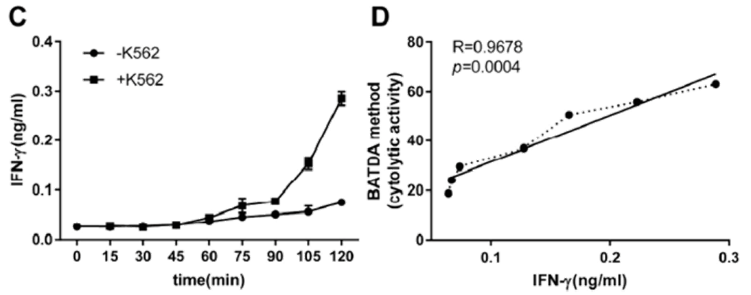 自然杀伤细胞(NK)是一种具有细胞毒性且非MHC依赖的淋巴细胞,顺利获得对靶细胞表面活化和抑制性受体的交叉识别,迅速响应病毒感染或肿瘤形成细胞释放穿孔素和颗粒酶使之裂解。相比于T细胞,NK更不易引发免疫风暴且异体NK不引起抗宿主反应,是日益重要的抗肿瘤免疫疗法。异体NK的来源之一是NK-92细胞株,其安全性和效力已在多项临床试验中被证实。准确、及时和易行的细胞免疫能力检测是NK免疫治疗产品的重要评估项目。孟主任团队希望找到一与细胞毒性高度相关的可靠生物标记作为评价产品效力的方法。团队对与K562细胞共培养活化NK细胞进行已知细胞毒性相关基因定量及转录组研究,寻找候选指标。结果认为IFN-γ是一潜在理想的检测标的,符合与毒杀能力相关、易检测且表达量和细胞活性呈正相关(相关系数0.9678)三个指标。