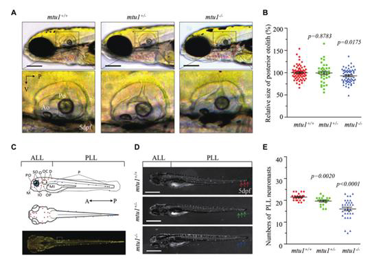 mtu1-/-突变斑马鱼耳石减小和侧线神经丘数量的减少