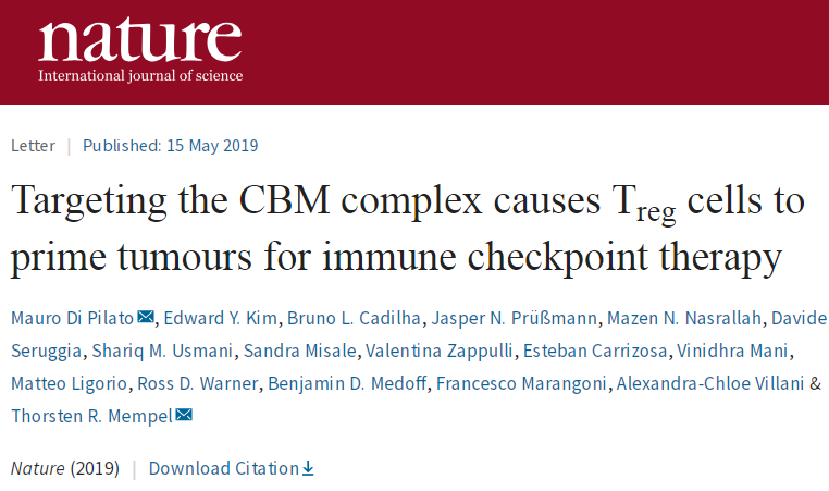 [2] Targeting the CBM complex causes Treg cells to prime tumours for immune checkpoint therapy. DOI:10.1038/s41586-019-1215-2